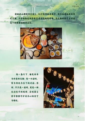 夜晚的山塘街華燈初上,紅燈籠倒映在水中。我們品嘗地道的蘇 式火鍋,手中的特色奶茶散發(fā)著(zhù)淡淡的桂花香,與火鍋的熱氣交織成 這個(gè)秋夜最溫暖的記憶。 每一盞燈下,都是市井 與詩(shī)意的交融;每一口滋味, 皆為傳統與當下的對話(huà)。蘇 州,不只是一座城,更是一種 生活美學(xué)的延續,在喧囂塵 世中靜靜守護著(zhù)內心的安寧 與雅致。 58